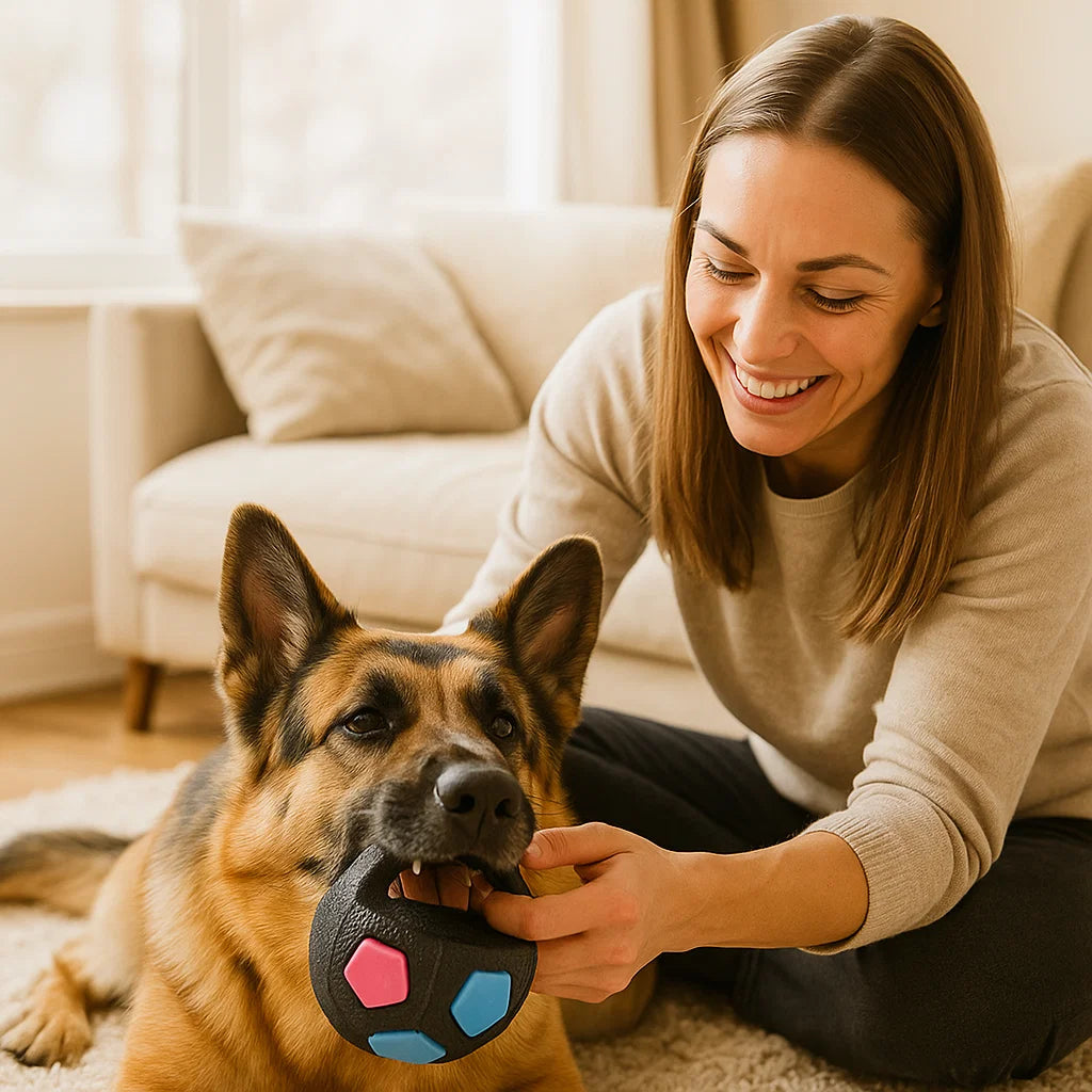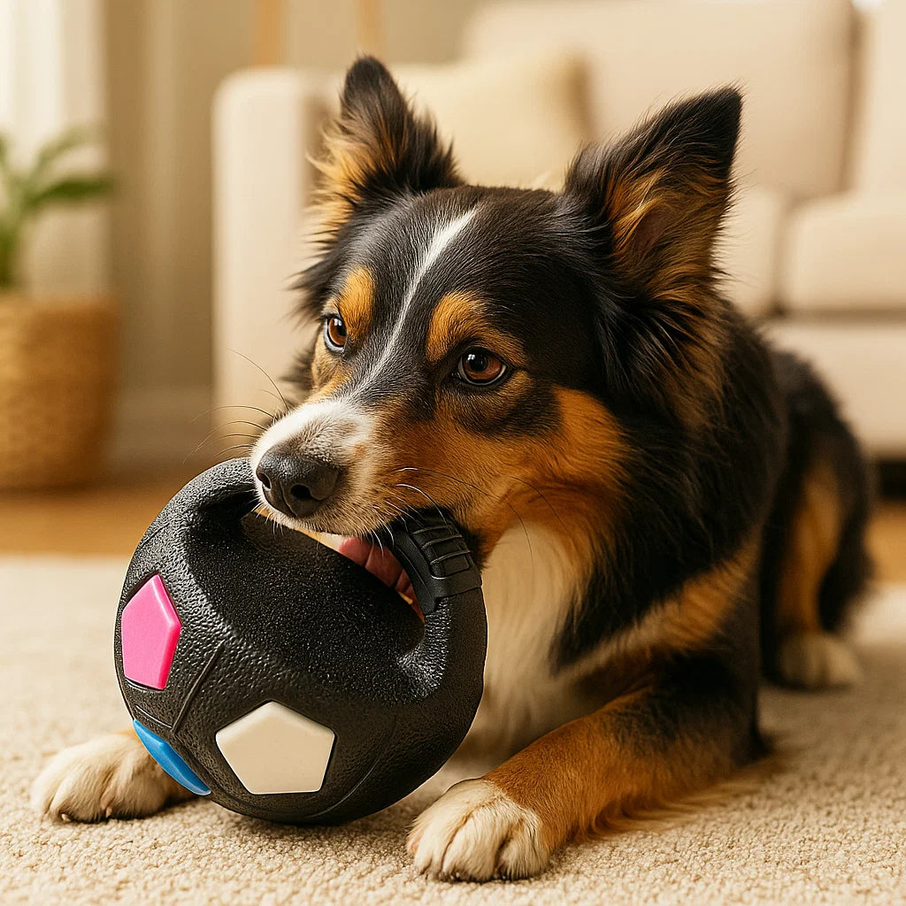 "My dog absolutely loves this ball! It keeps him busy for hours and really helps with his chewing habits. The material is super strong, and I can tell it’s great for his teeth too!"