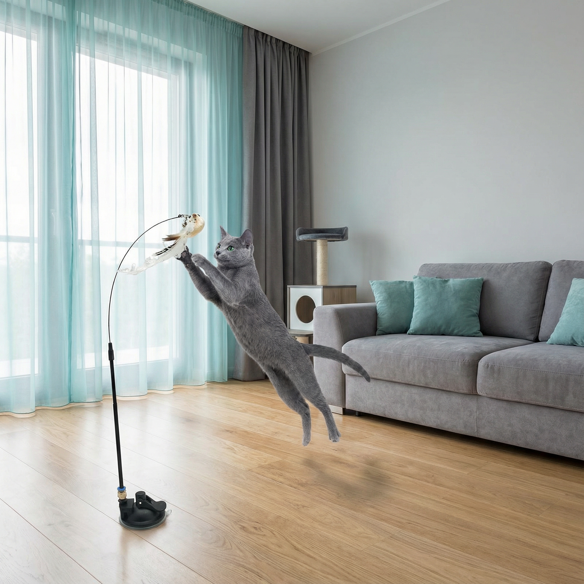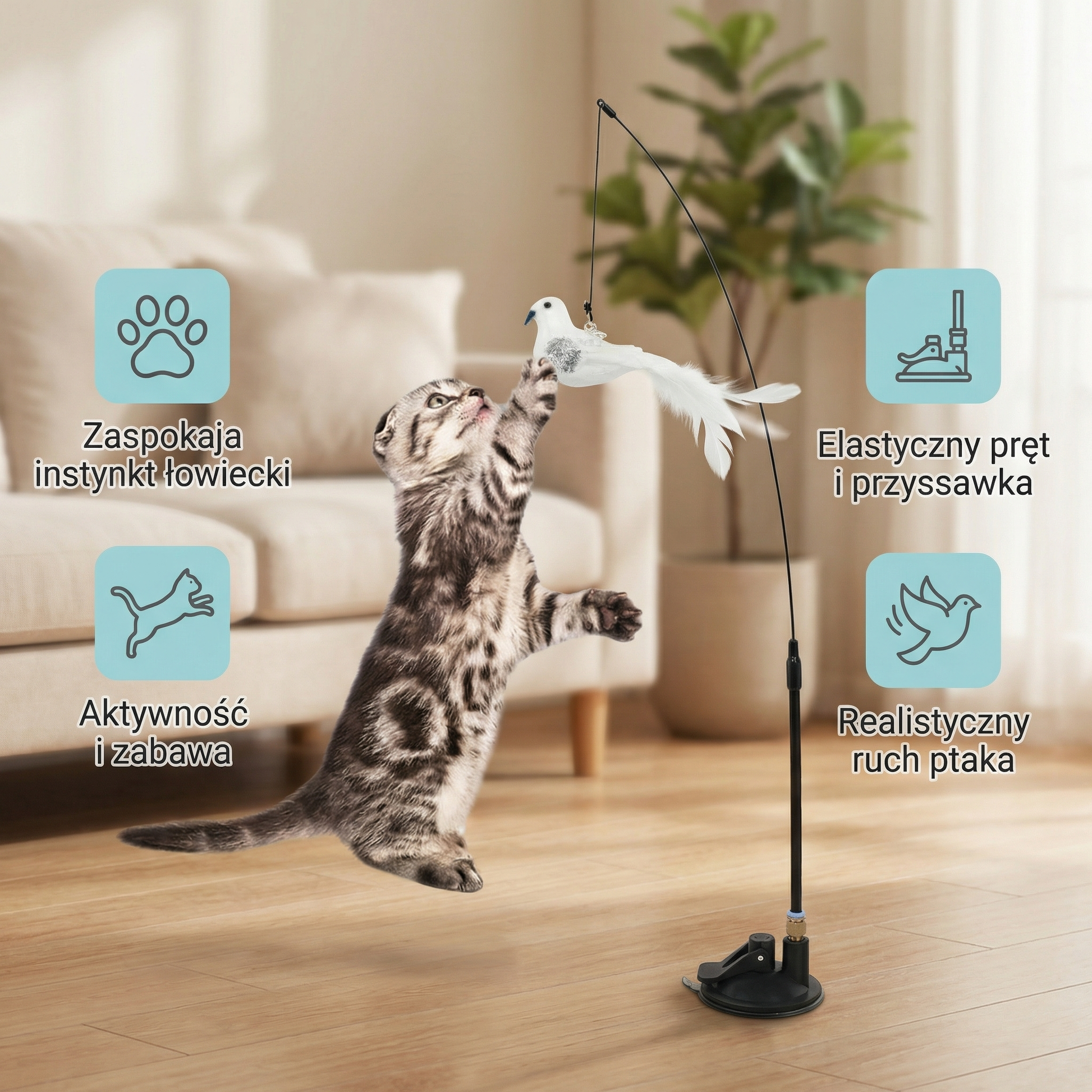 Interaktywne „polowanie” angażuje ciało i umysł kota: skoki, szybkie zwroty i łapanie poprawiają koordynację, a zmienne trajektorie lotu ptaka utrzymują zainteresowanie na dłużej. To świetny sposób na rozładowanie energii, szczególnie u kotów niewychodzących.
